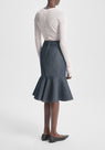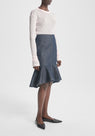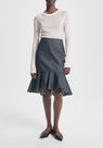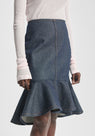 The raw denim skirt is with a petal frill at the hem, creating sculptural drama. Its structured silhouette is complemented by the bold wave like frill, offering a new take on contemporary femininity.