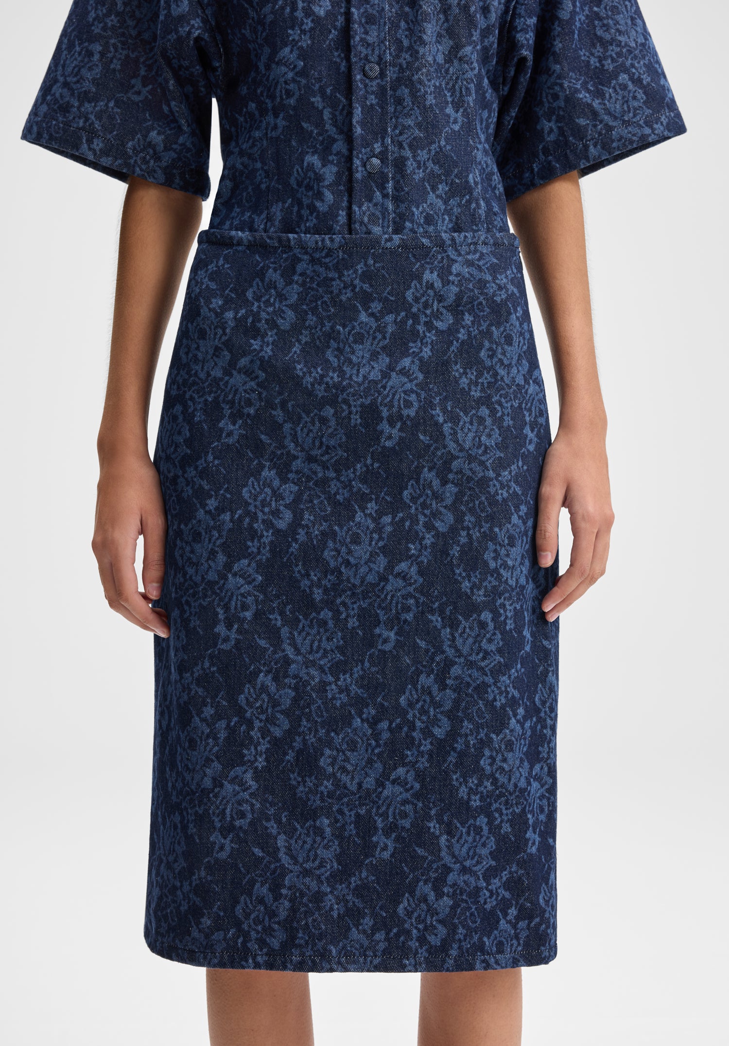 Pencil skirt in laser-printed organic cotton denim, adorned by the PS26 signature rose lace motif. Darts at the back give subtle shape to a straight, just-above-the-knee silhouette. Complete with a side zip-and-button closure.