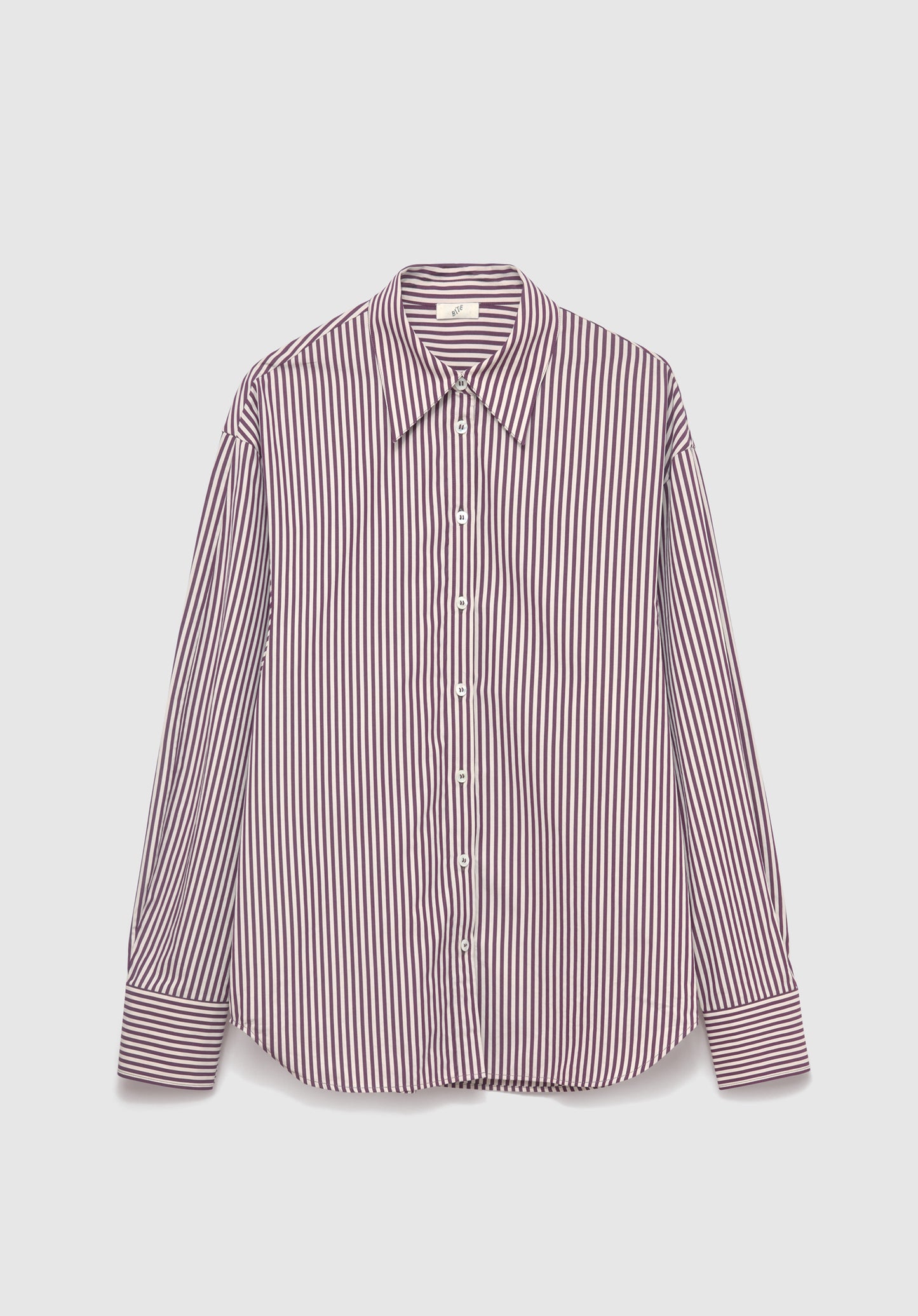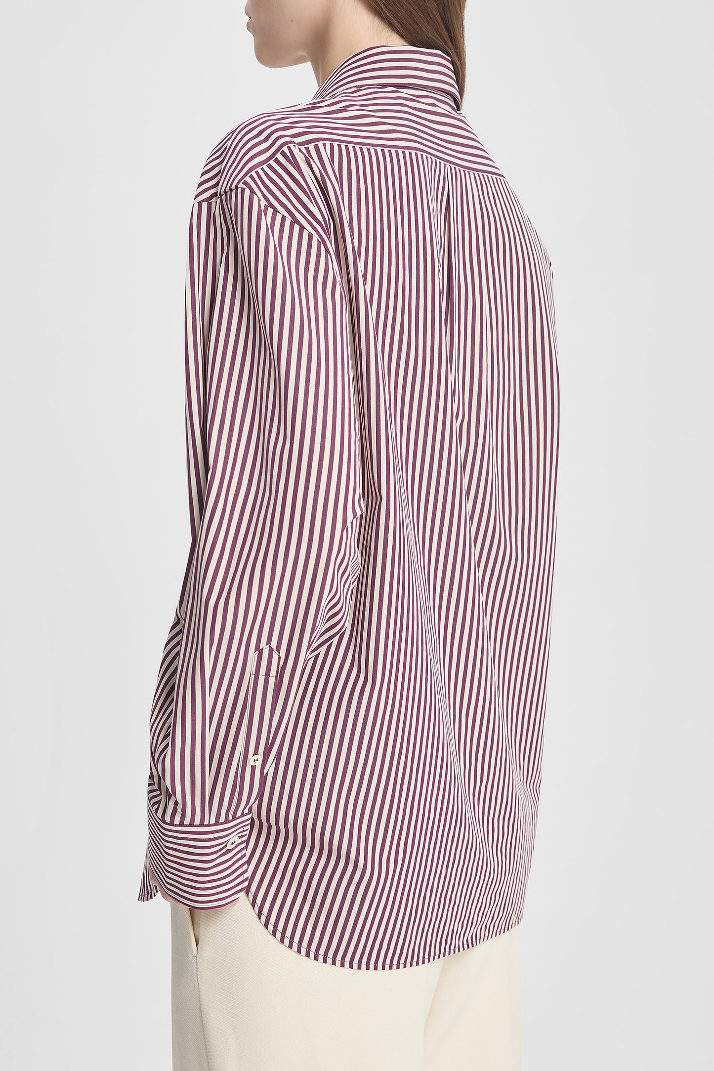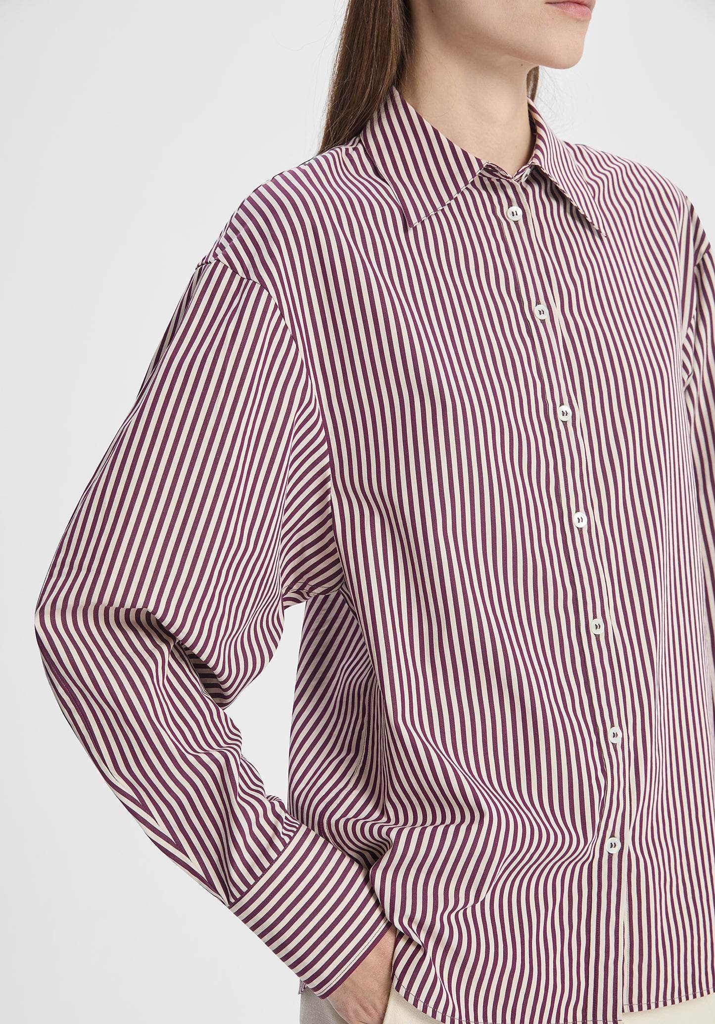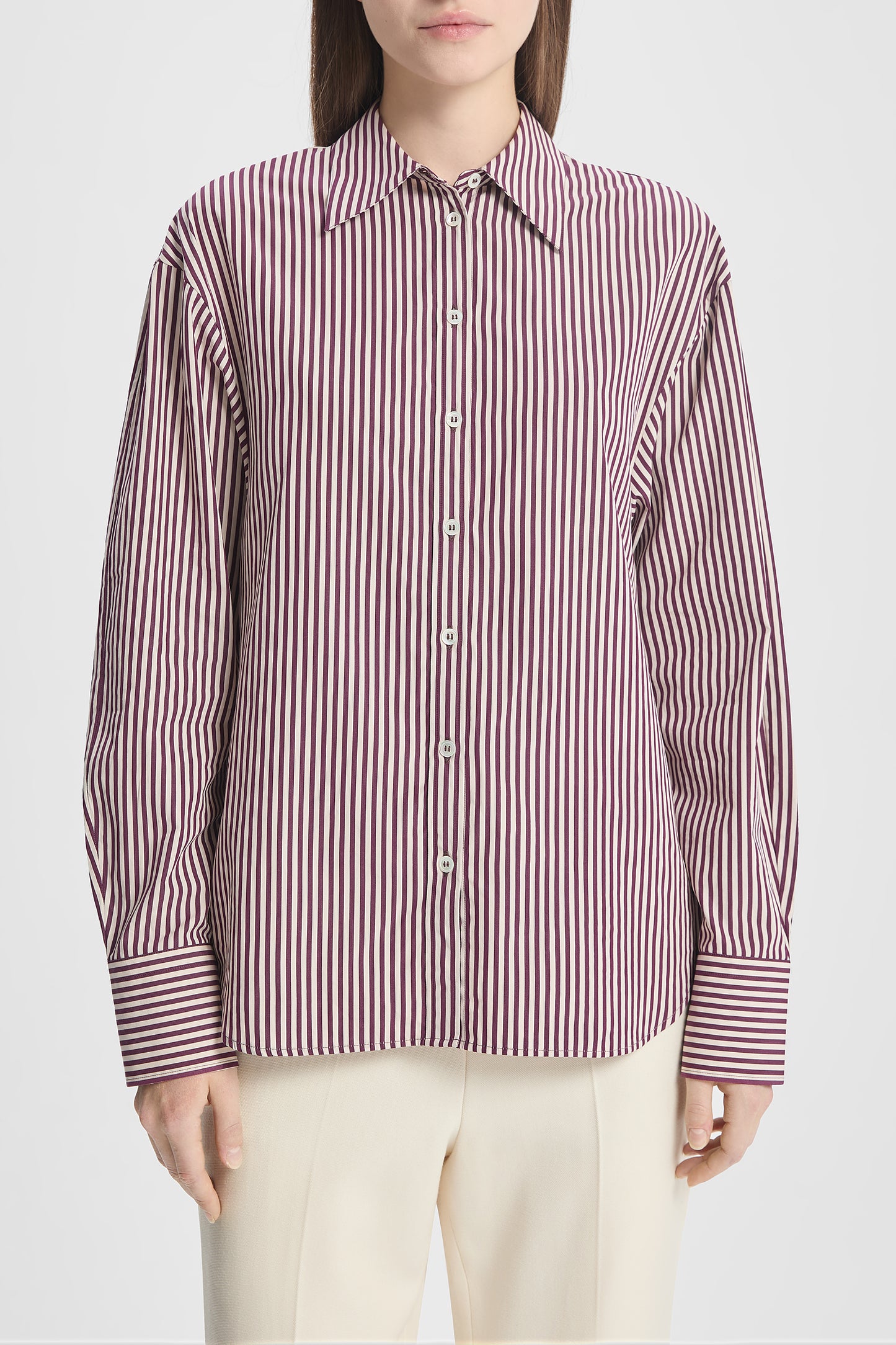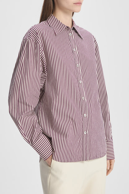 Crafted from high-quality cotton poplin in a plum stripe, this shirt is designed with a structured collar, sculpted sleeves with a subtle curve, and a gently fitted silhouette. Pair with the matching Maxime Striped Poplin Skirt for a cohesive look, or style with tailored separates for effortless elegance.